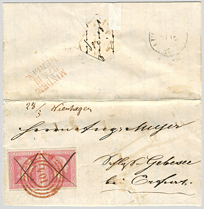 Das Titelfoto zeigt einen Brief von Nienhagen (Provinz Sachsen, OPD Magdeburg, Kreis Oschersleben) im nördlichen Harzvorland, an der Holtemme gelegen, nach Schloss Gebesee bei Erfurt (Provinz Sachsen, OPD Erfurt, Kreis Weissensee).