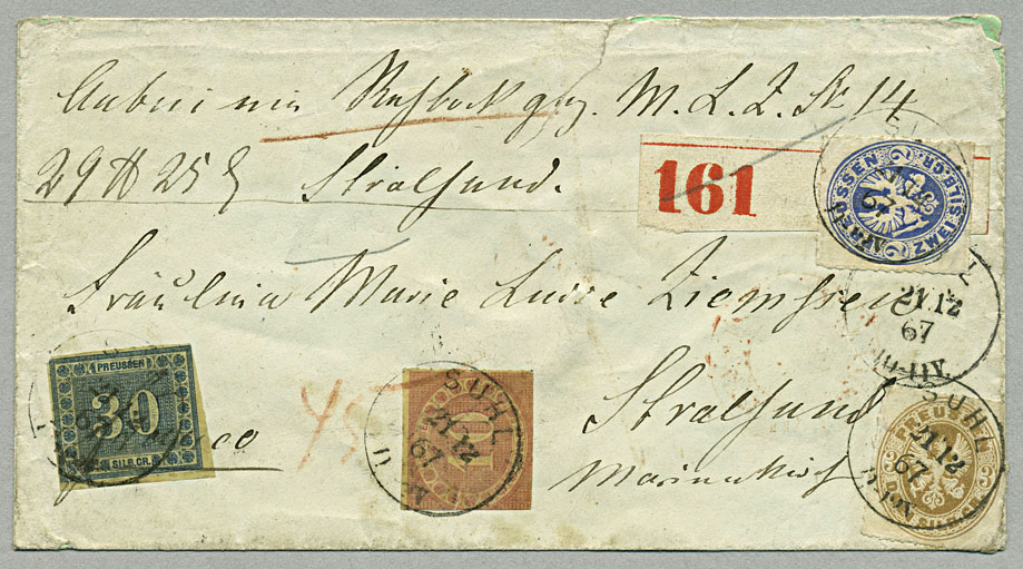 Solch eine „bombastische“ Frankatur war in Preußen in besonderen Fällen (Pakete, Wertsendungen) möglich. Mit 45 Sgr. ist dies hier der Fall! Dass dazu die hohen Werte von 10 und 30 Sgr. verwandt wurden ist durchaus nachvollziehbar, aber als Buntfrankatur bis zum 31.12.1867 äußerst selten anzutreffen.
