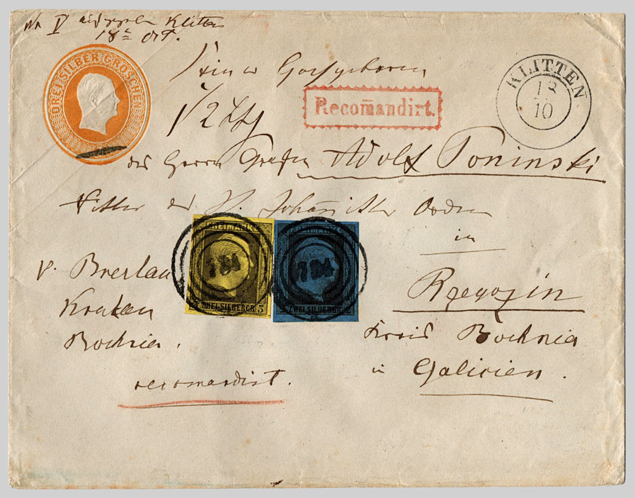 Das Titelfoto zeigt einen großformatigen gelben 3 Sgr.-Ganzsachen-Umschlag (U3B(1)), Schilling-Nr. „1“ mit Zusatzfrankatur von Klitten (Provinz Schlesien, OPD Liegnitz, Kreis Rothenburg) nach Rzegozina bei Bochnia in Galizien.
