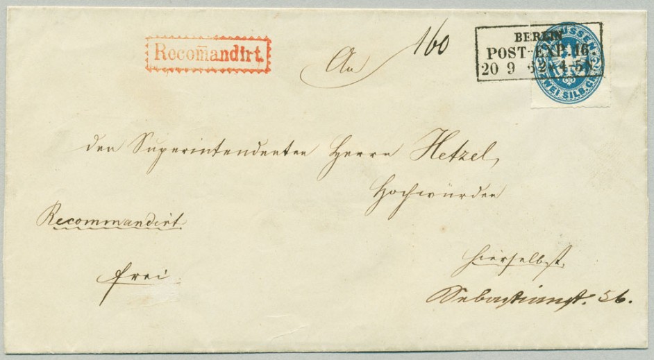 Während der Markenzeit galt, dass für die Rekommandation 2 Sgr. zum Briefporto hinzukamen.
