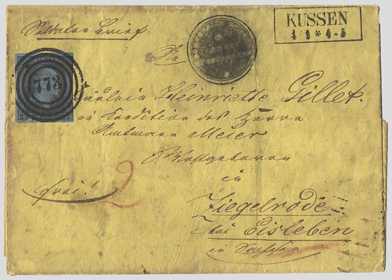 Er ist mit einer 2 Sgr.-Marke schwarz/blau der ersten Ausgabe (Mi. Nr. 3) freigemacht. Darüber befindet sich der handschriftliche Hinweis „Soldaten Brief“. Die Marke ist mit dem Nummernstempel „773“ entwertet. Zusätzlich wurde der 2-zeilige Rahmenstempel „KUSSEN 4 1 * 4-5“ als Aufgabestempel abgeschlagen.