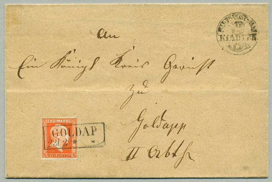 oben befindet sich der schwarze Krone-Posthorn-Stempel der