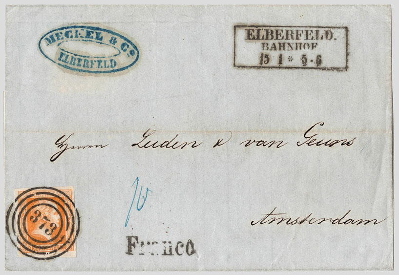 dem Nummernstempel „373“ (Elberfeld) entwertet. Zusätzlich wurde