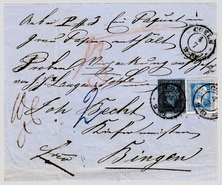 2-Sgr.-Freimarke der 1. Ausgabe von 1850 und eine Freimarke zu 2