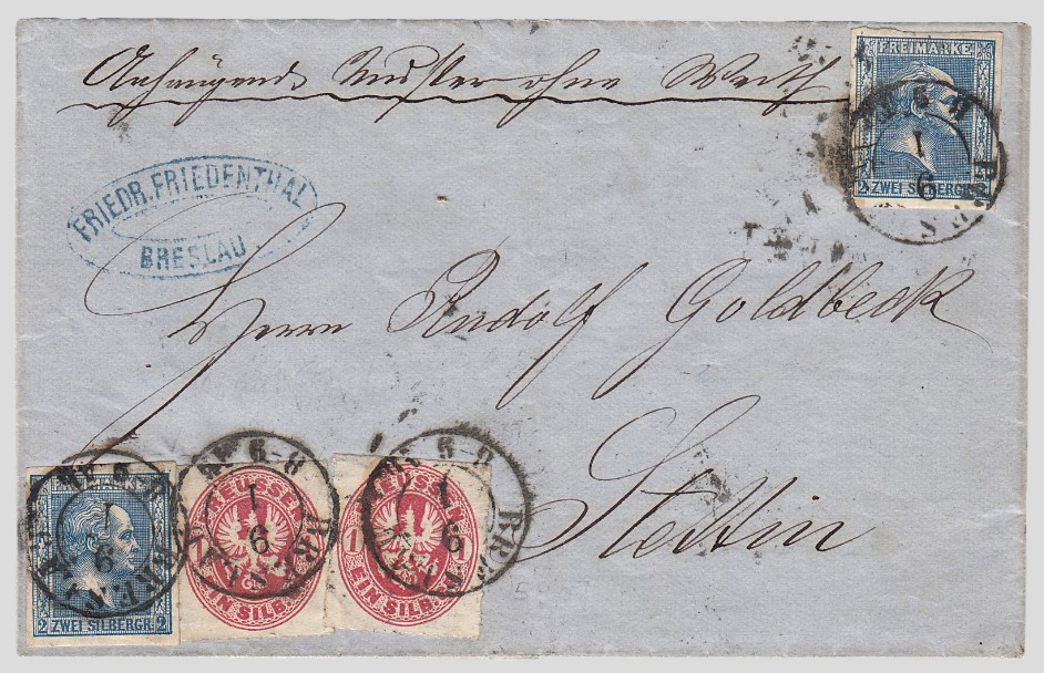 Mischfrankatur, bestehend aus zwei Freimarken zu je 2 Sgr. der