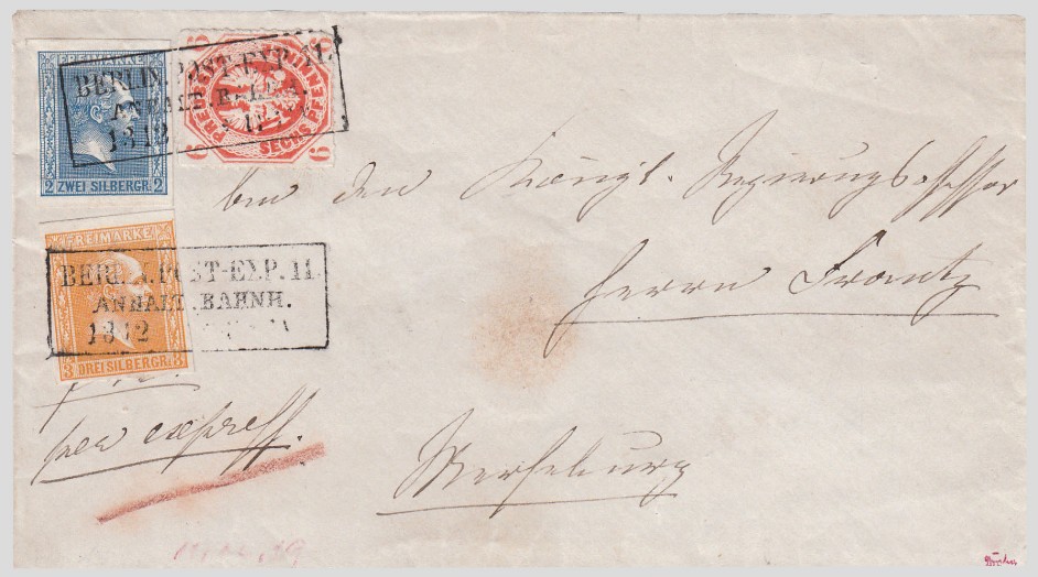 Der Express-Brief wurde mittels einer Mi.-Nr. 11a = 2 Sgr. und Mi.-Nr. 12a = 3 Sgr. sowie Mi.-Nr. 15a = 6 Pf. frankiert.